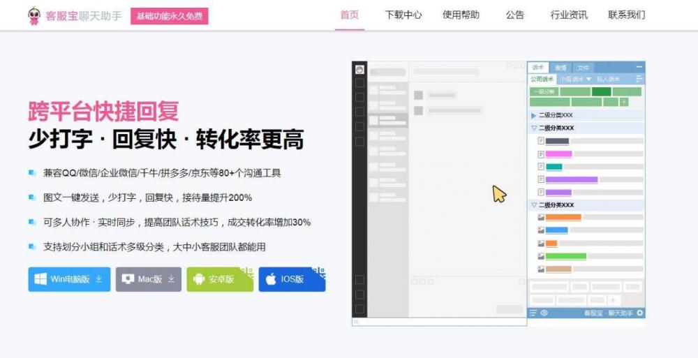 “聊客户再也不用辛苦打字和复制粘贴了,使用客服宝就能一键回复”。客服宝是一款跨平台快捷回复工具,让客服少打字回复快,解决客服工作中相同问题重复回复,打字又慢又辛苦的问题,还能大幅提升对话质量。它会自动吸附在***、QQ、千牛、企微、京东、拼多多等各类聊天软件的旁边,只需要将你常用的话术放在客服宝中就可以一键回复,多人共享,实时同步。