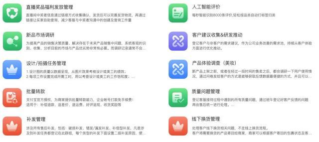功能介绍:宜家式拼装能力引擎,可实现标准化组件与个性化需求的完美统一,满足品牌个性化服务场景使用需求,助力品牌串联线上线下业务,节省售后登记流传效率,成倍提升人效。