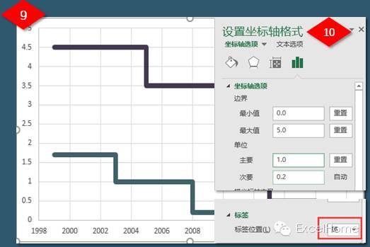 (8)选择垂直坐标轴,右键【设置坐标轴格式】更改值,【标签位置:高】