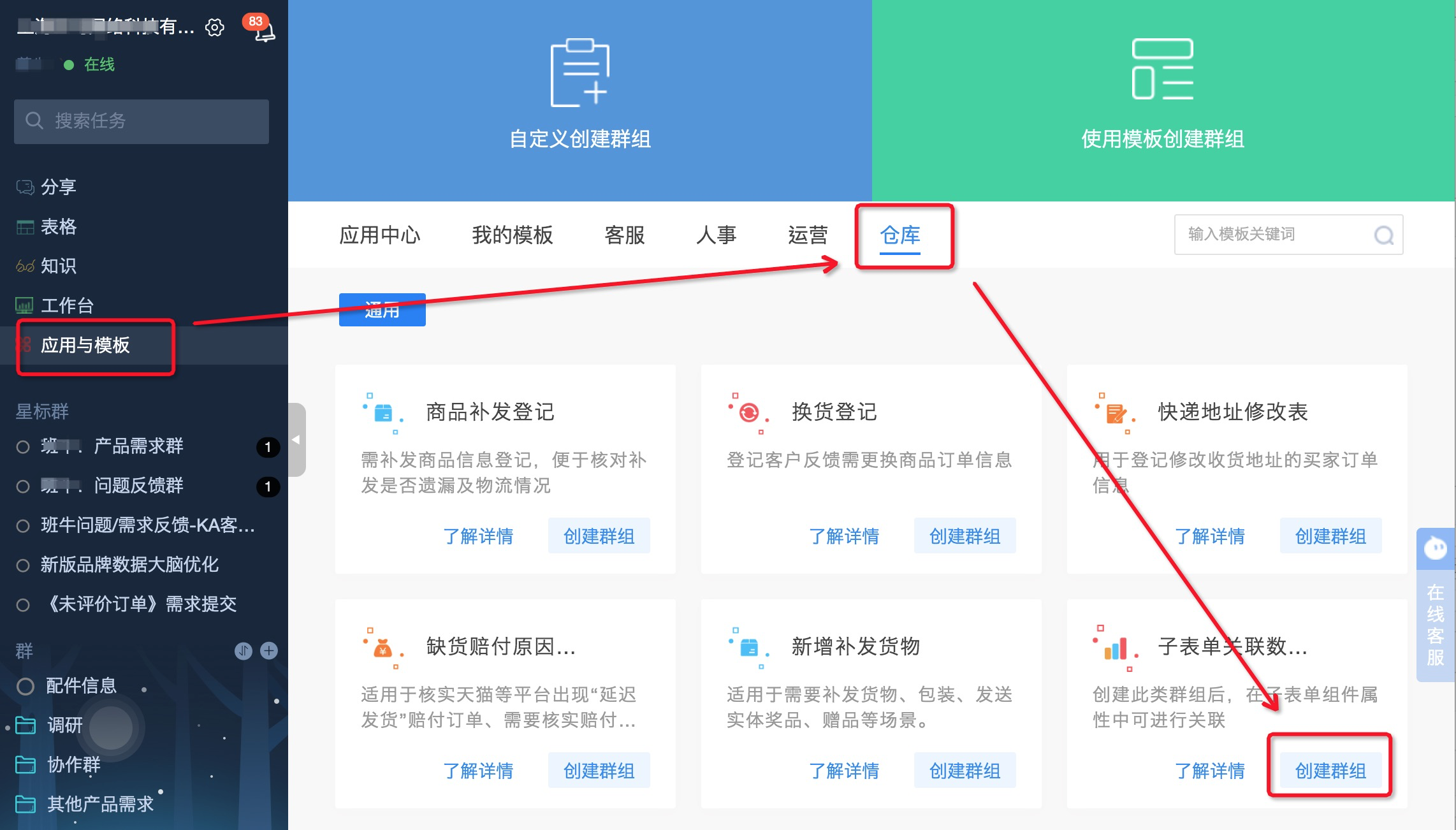 应用与模板 》仓库 》选择应用:子表单数据表 》创建群组 》在群组中导入需关联的数据(如:配件信息)