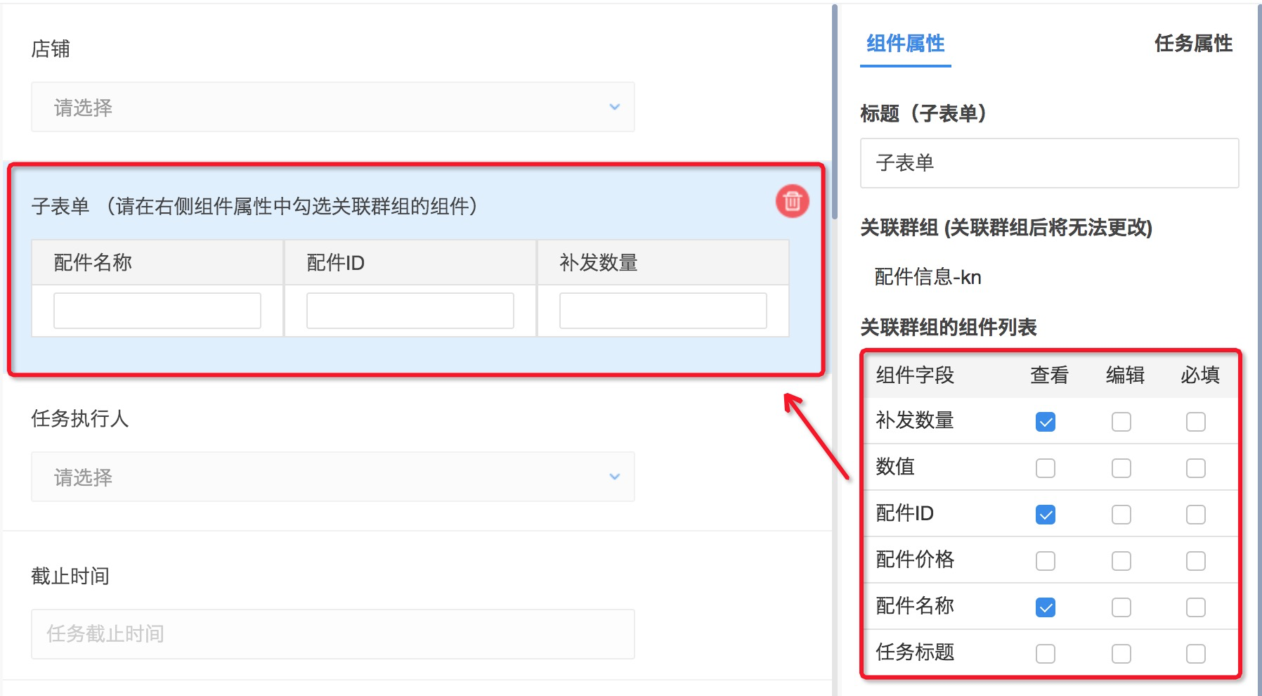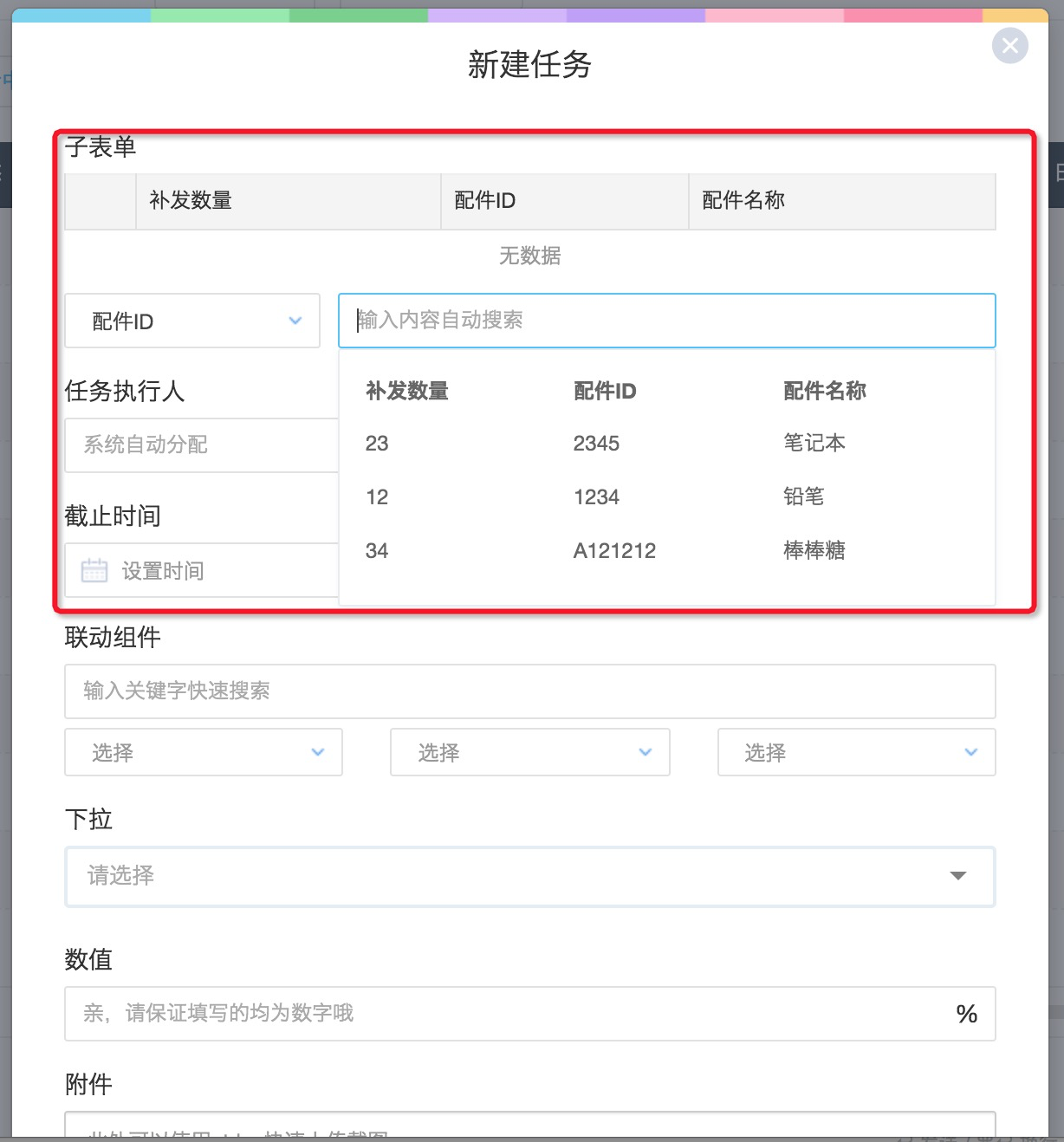 1,子表单组件:可将多个配件关联到一个补发任务中;