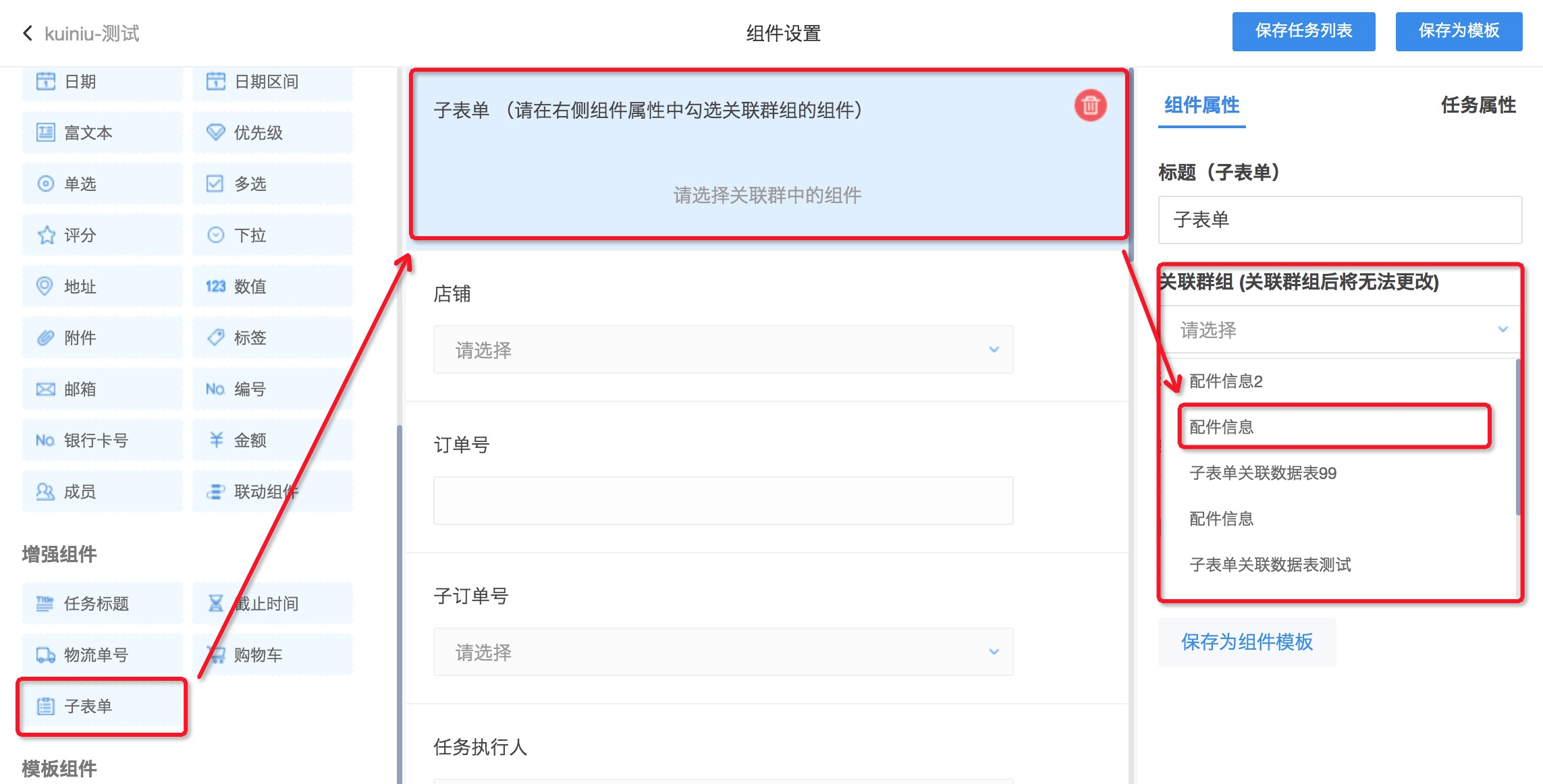 在实际的电商业务场景中,一个工单任务可以包含多条信息,比如商品信息、配件信息等,目前班牛系统无组件支持这种应用场景,子表单组件本质是一种表单,可以作为组件添加至群组组件中,这种数据结构可满足上述应用场景。