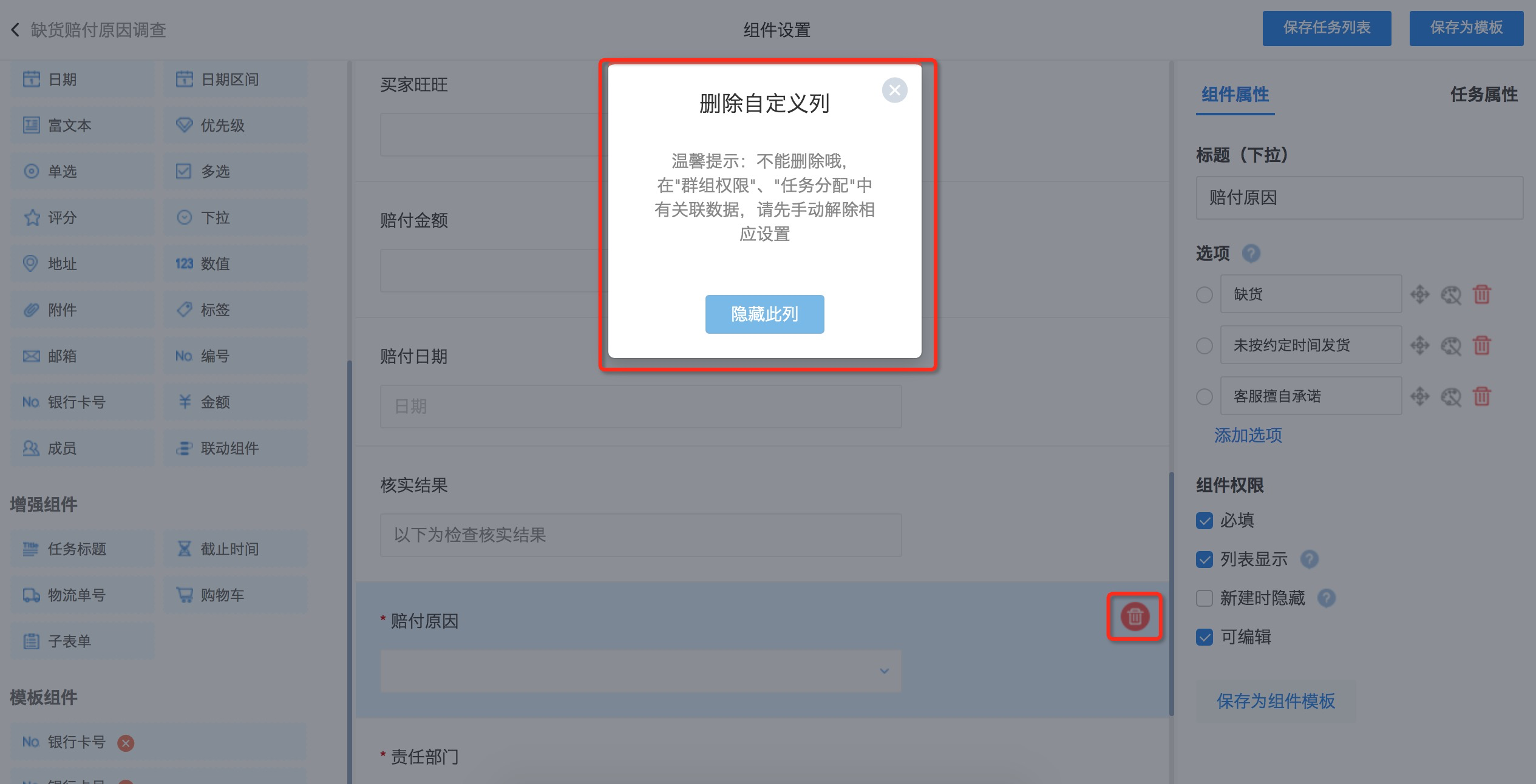 字段删除对有关联数据、自动分配任务、流程等校验不能删除,除非手动解除关联关系