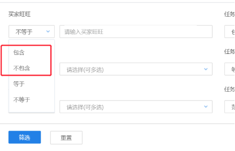 在“支付宝、买家旺旺、运单号、物流单号”这几种筛选项的查找方式里,在原有的查找方式不变的情况下,新增“包含、不包含”的查找方式,新增的几种查找方式逻辑与“单文本、多文本”组件的查找方式一致