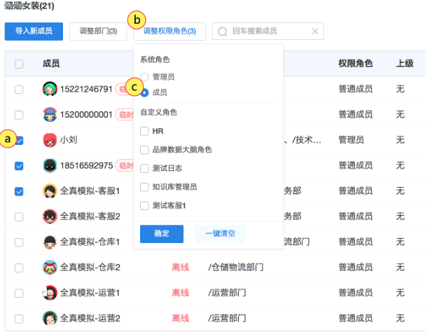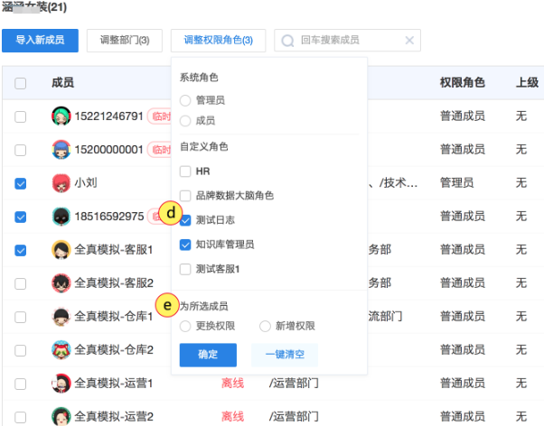 b. 点击“调整角色权限”(带上勾选的成员个数)按钮