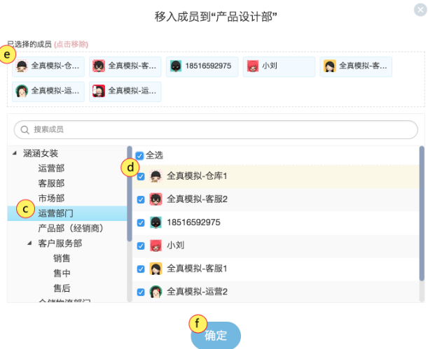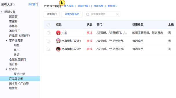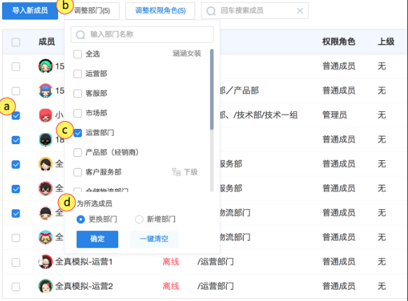 b. 点击“调整部门”(带上勾选的成员个数)按钮