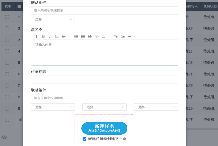《新建任务》按Alt+S/Control+Alt+S组合键保存新建;新建后继续创建下一条