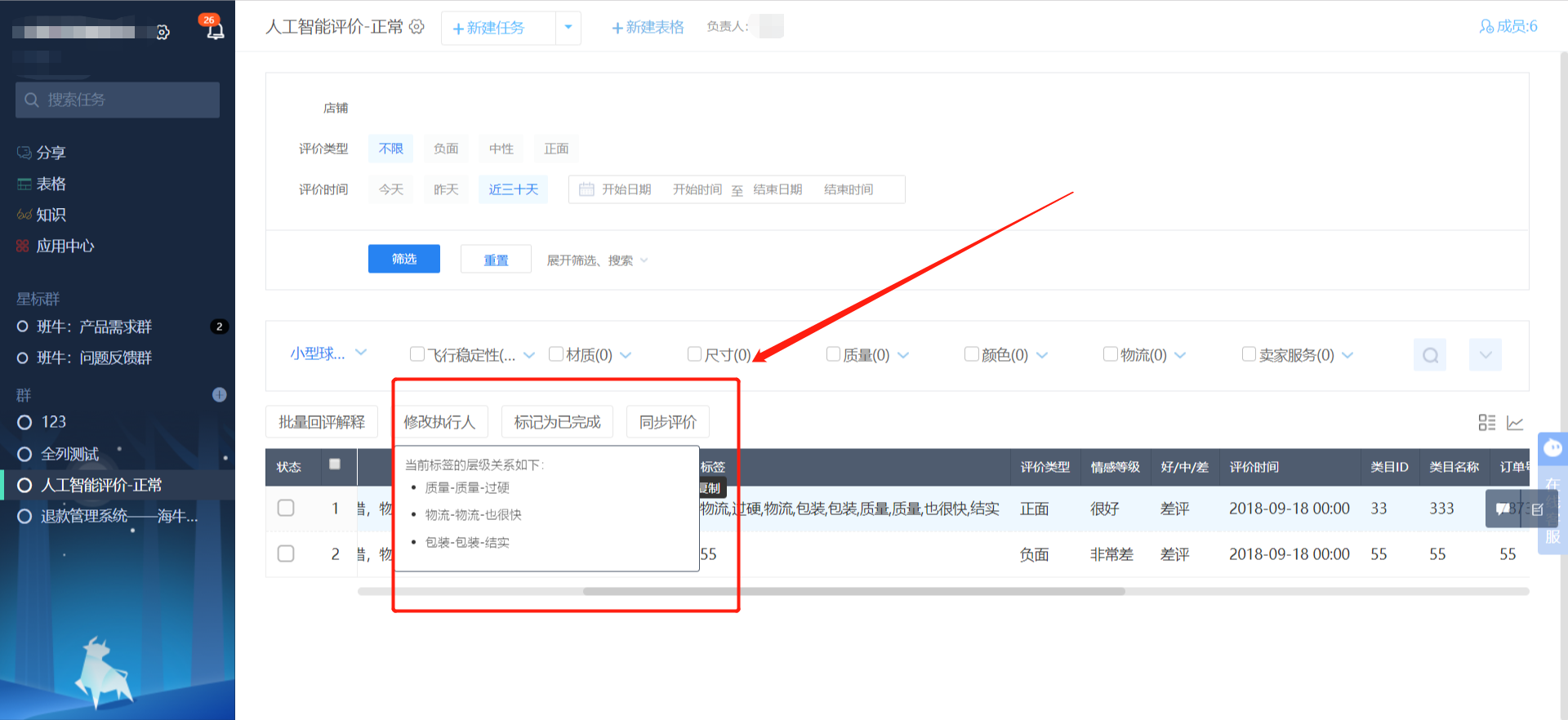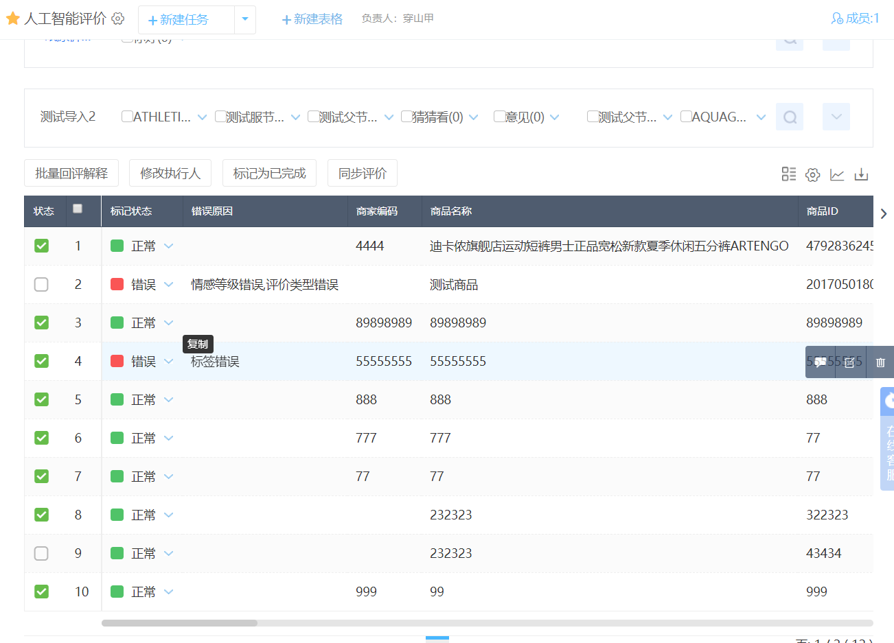 新增人工智能评价错误反馈功能,对于人工智能打上的标签、评价类型、情感等级若有错误可对该记录进行错误标记,会定期反馈至平台进行修复