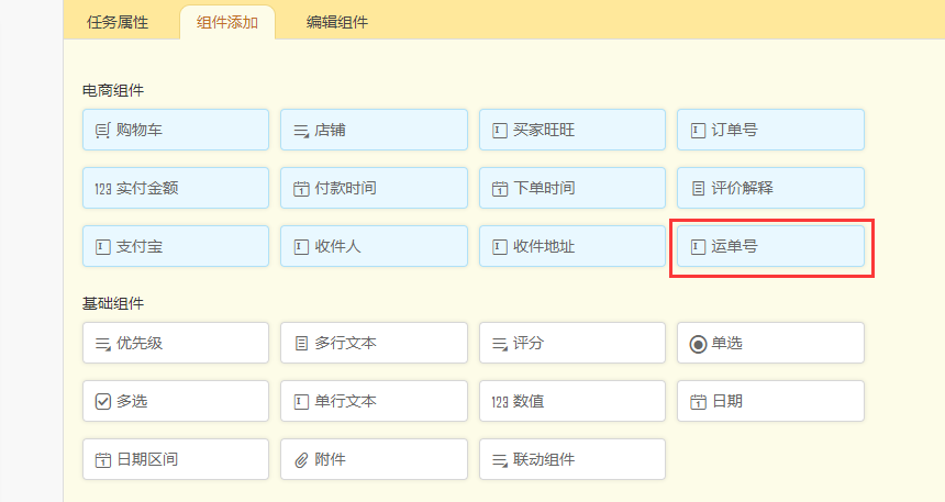 电商组件内新增运单号组件,创建任务时输入订单号,可自动拉取运单号