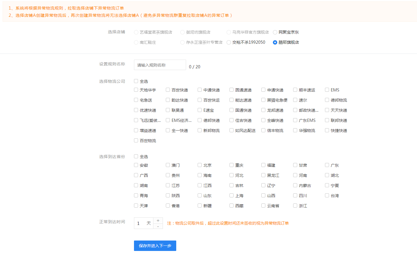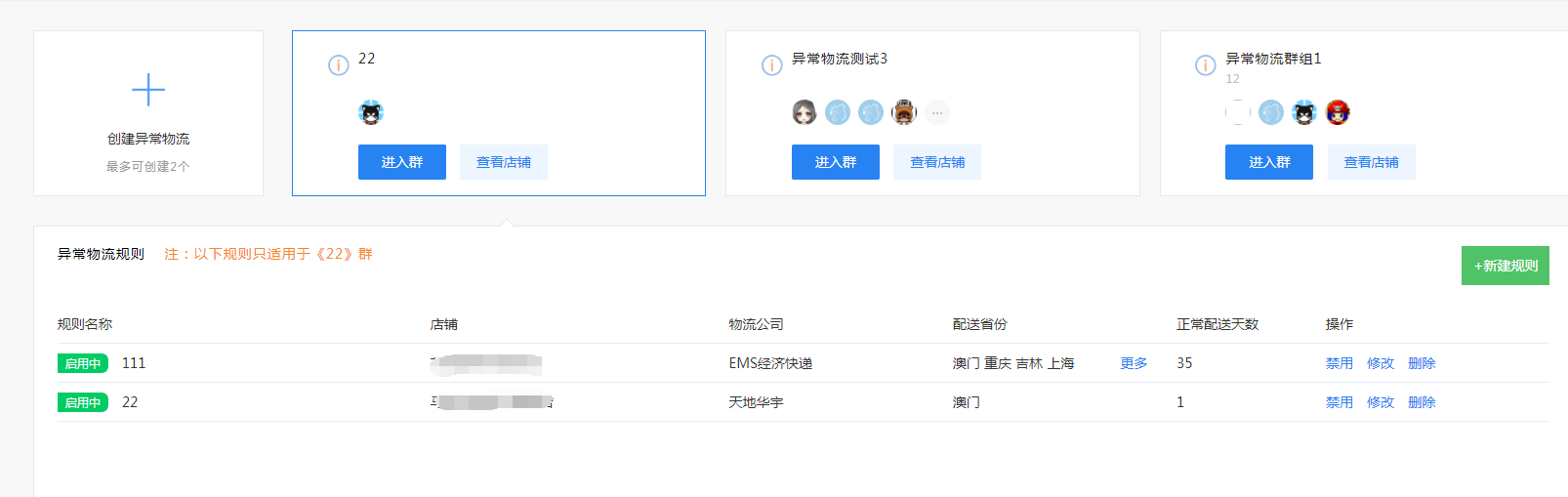 根据物流公司、配送省份等信息设置物流配送时间规则,超出设置时间,系统自动标记为异常物流并拉取数据到所创建的异常群组内,以便客服及时查看异常物流原因并作出处理,省时省力