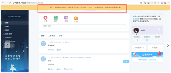 班牛在发布上线新功能前,会提醒用户,系统在某个时间段将进行维护,届时用户将无法使用班牛