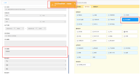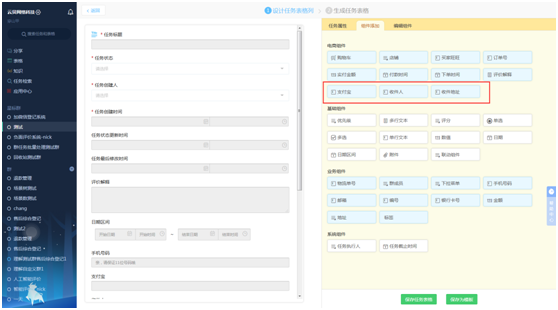 一、新增电商组件:新增【收件人】、【收件地址】、【支付宝】三个组件,在电商列表内显 示,输入订单号,可自动拉取收件人和收件地址